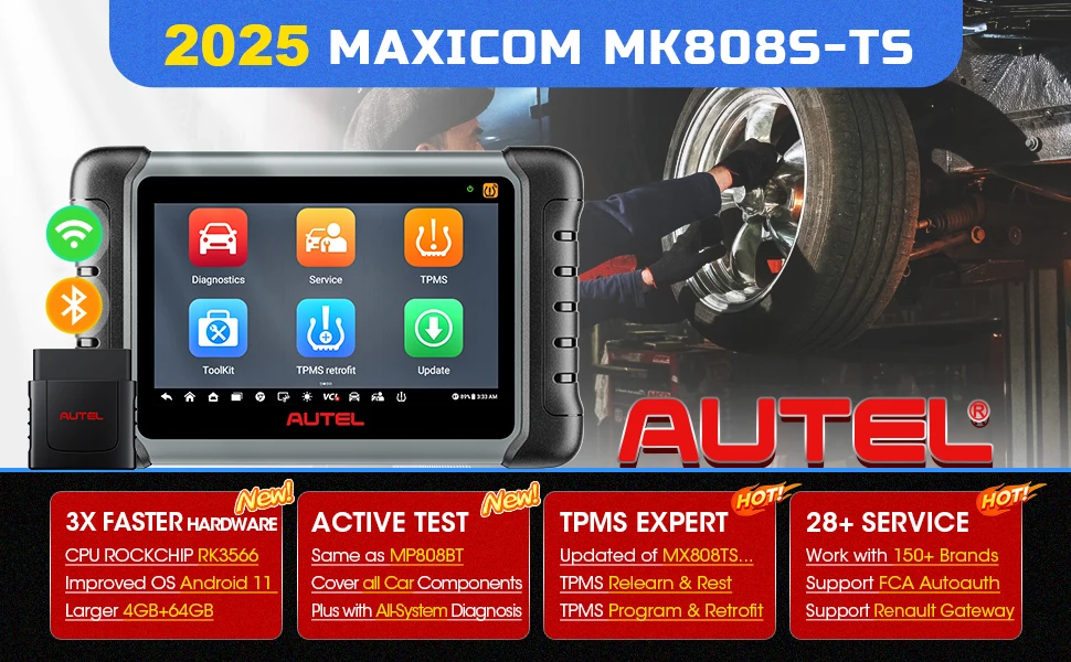 The Autel MK808S-TS Scanner is a versatile tablet device engineered to perform a wide range of advanced service functions, including comprehensive TPMS operations, TPMS retrofitting, 36+ reset services, and full-system diagnostics.