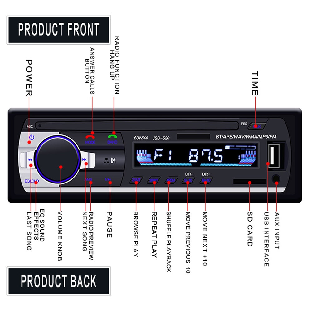 JSD-520 12V Bluetooth V2.0 USB/SD/AUX Car MP3 Radio Auto Stereo Audio Player MMC Subwoofer Vehicle 1Din FM Receiver Autoradio