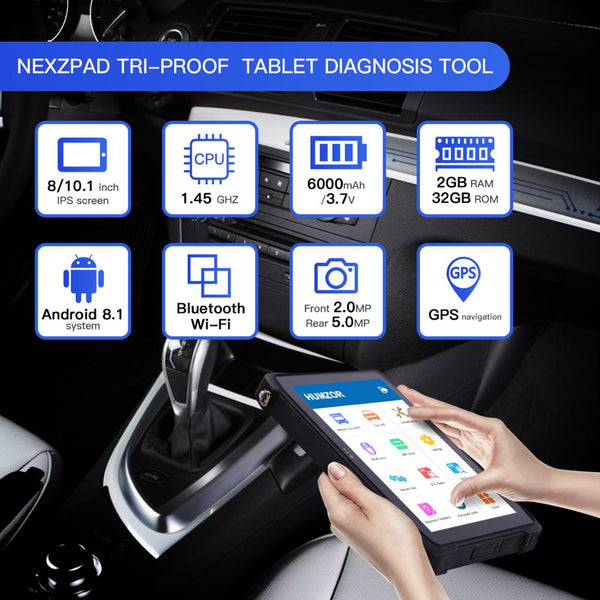 NexzPad is the high-end professional and intelligent diagnostic equipment newly released by Humzor. Featuring the powerful tri-proof industrial tablet with 8.0 or 10.1 inch capacitive screen and based on Android 8.1 multitasking operating system, it greatly provides a quick access to read/clear codes for all the available modules of wide vehicle makes.