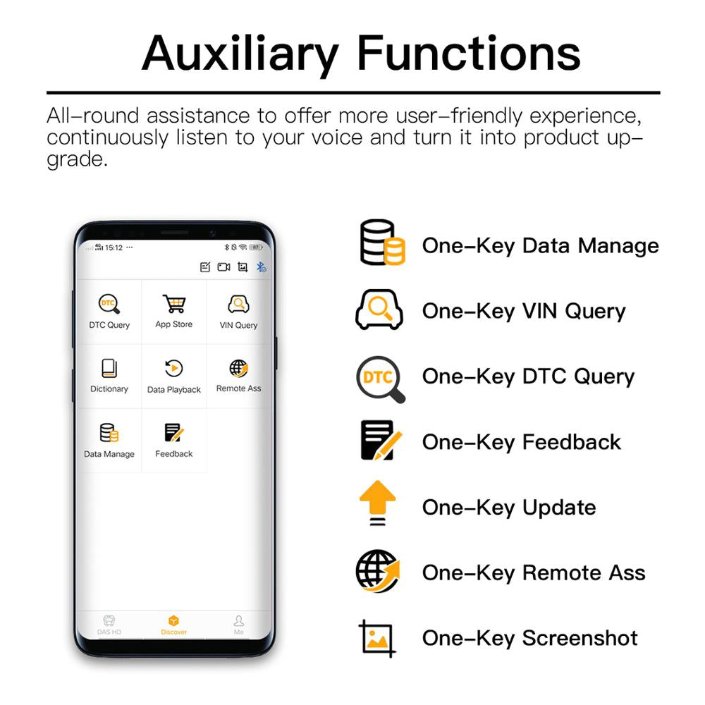 Quick access to VIN Query, DTC Query, Data Manage, Data playback, Feedback icon, Screenshot, etc. fully provide you with intelligent and easy operation.