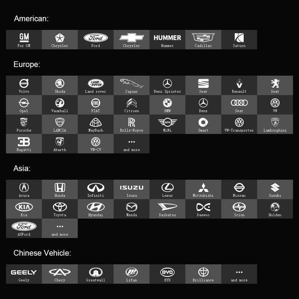 Europe: for Volvo, for Skoda, for Land rover, for Jaguar,for Ford, for Sprinter, for Seat, for Renault, for Peugeot, for Opel, for Vauxhall, for Fiat, for Citroen, for BM-W for BENZ, for AUDI, for VW, for Porsche,for Lancia, for MayBach, for Rolls-Royce,for Mini, for Smart, for Transporter, for Lamborghini, for Gugatti, for Abarth,for VW_CV