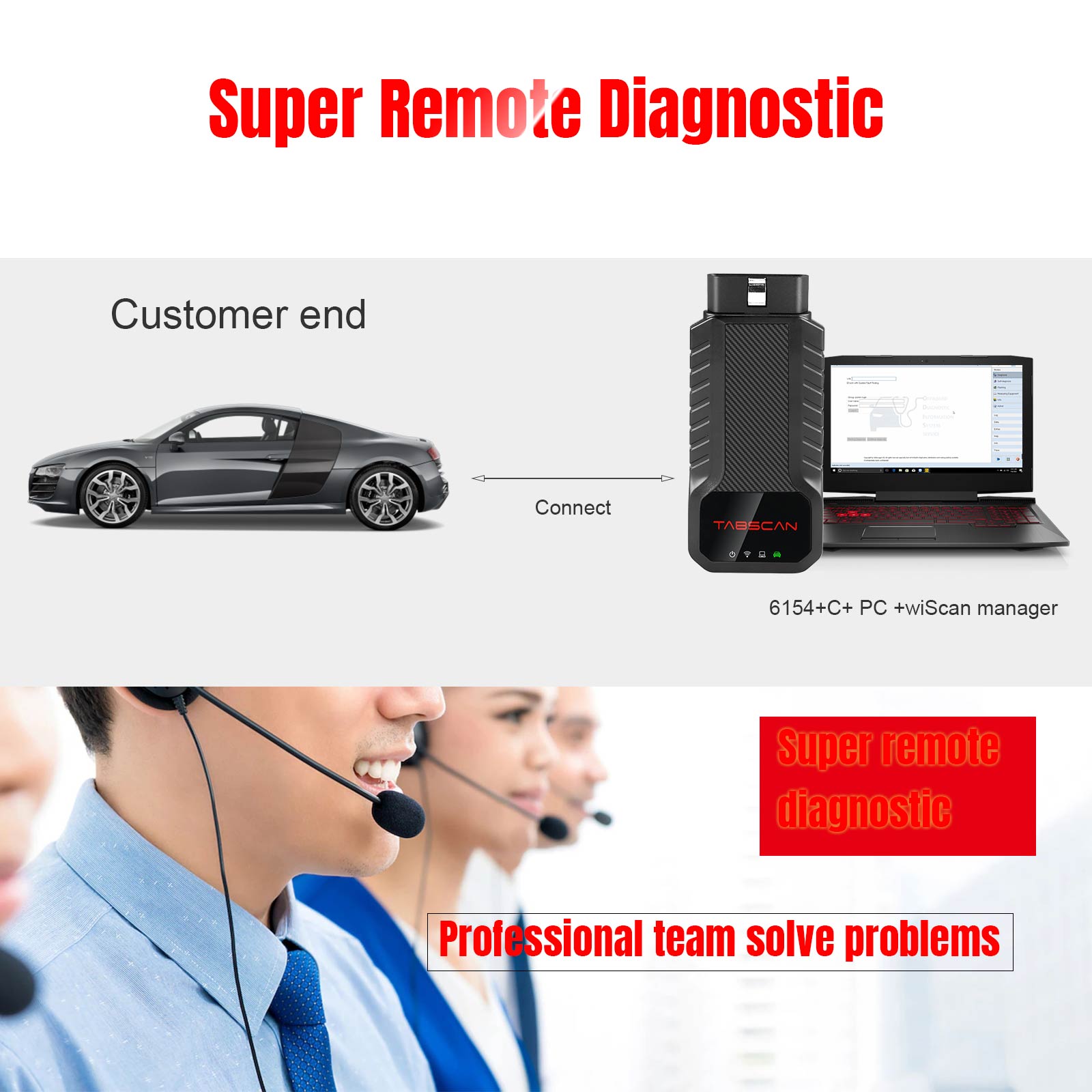 TabScan 6154+C is based on J2534, PDU and DOIP protocols, and connected to PC to perform ODIS original diagnosis, including online programming, DTCs guide, coding, repairing manual view, wire diagram view, engineer permissions, etc. TabScan 6154+C supports wiScan super remote, sending request on platform, and the professional technician team will accept the request and confirm the repair plan.