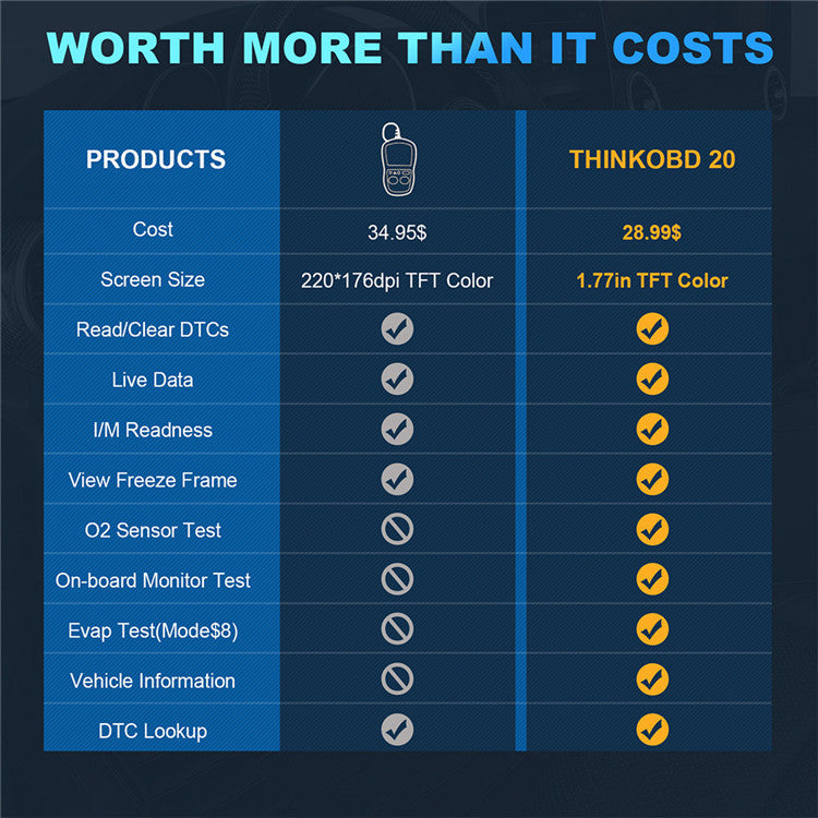 THINKOBD 20, with all 10 modes of OBD2 functions, DTC Lookup, 1.77'' LCD color display. It really is an excellent OBD2 code reader that you should have as standard equipment in your car. It allows do-it-yourselfers and mechanics to perform smog tests and solve basic engine and exhaust problems.