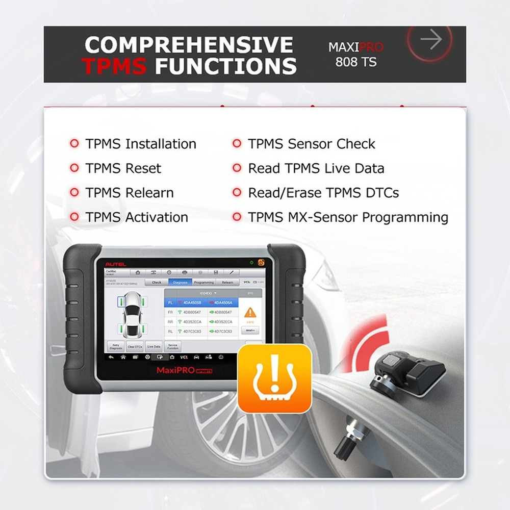 MP808TS, being available to activate 98% of all-known TPMS sensors, provides the most advanced TPMS diagnosis and the most comprehensive OBD relearn coverage for a complete TPMS health check, allowing technicians to solve TPMS related problems with a series of quick and effective operations: