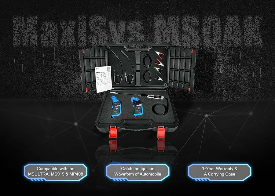 The MSOAK, compatible with the MaxiFlash VCMI included with the MSUltra and MS919, and the MP408 4-channel oscilloscope (sold separately), includes the 65A AC/DC Current Clamp, 650A AC/DC Current Clamp, Coil On Plug Probe, HT Extension Lead (2pcs) and Battery Clip (2pcs), within a blow-molded carrying case.