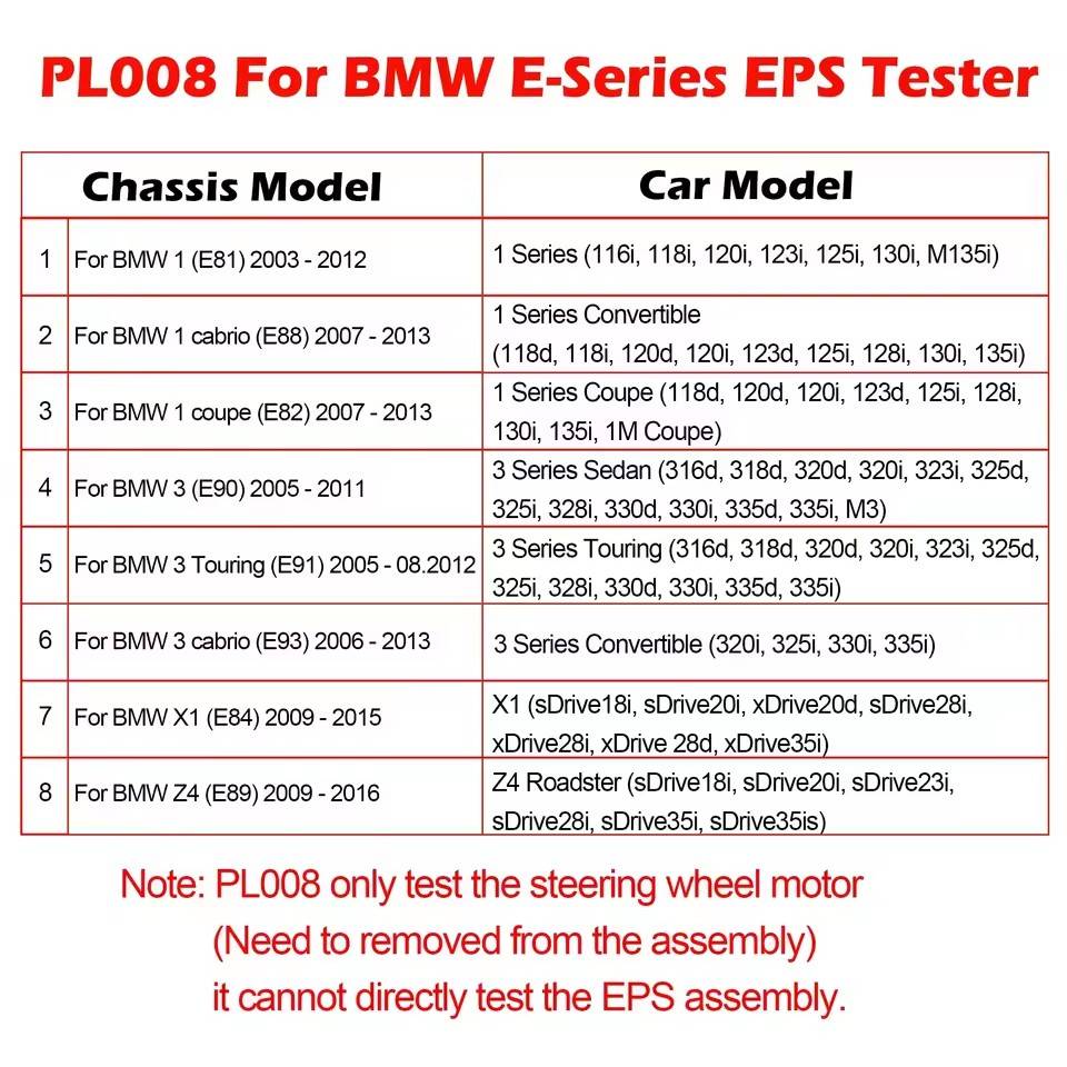 Note: PL008 only test the steering wheel motor (Need to removed from the assembly)